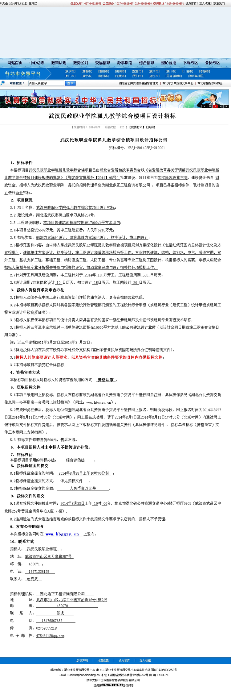 武汉民政职业学院孤儿教学综合楼项目设计招标