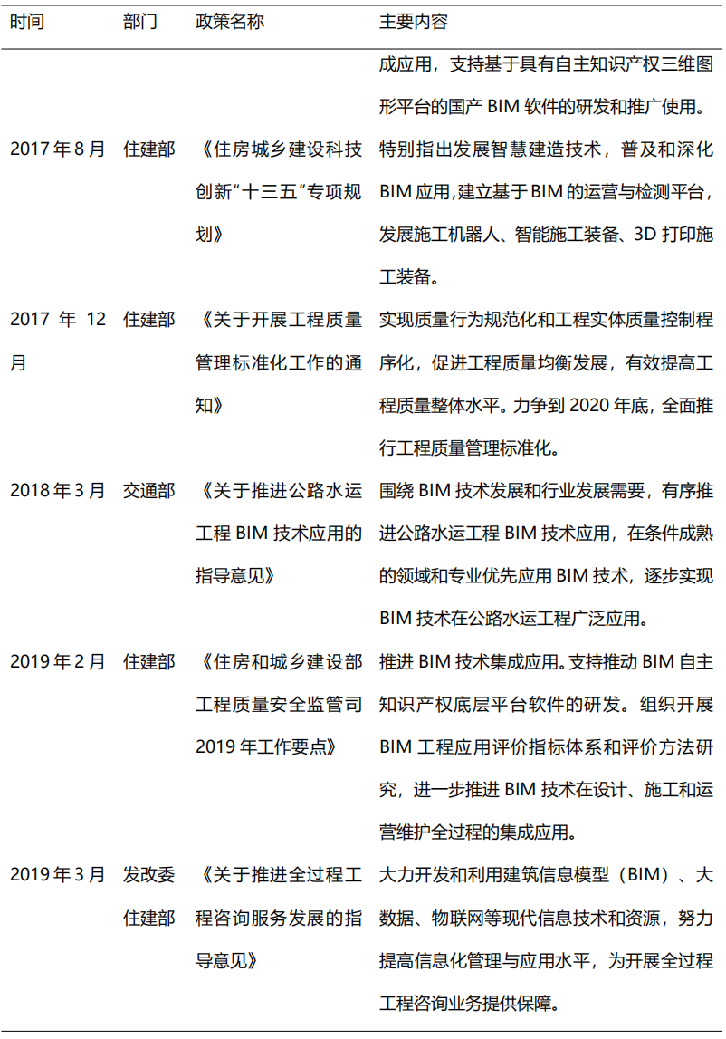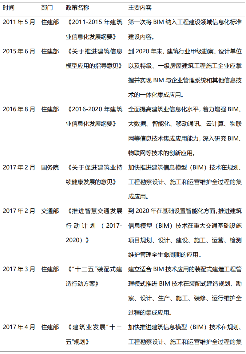 随着社会的发展,行业需求的转变,加之国家和各地政府的扶持,建筑行业信息化、数据化、智能化趋势不可逆转。BIM势必全面应用到规划、勘察、设计、施工和运营维护中来,实现工程建设项目全生命周期数据共享和信息化管理。近年来,国务院、住建部等相关单位,频繁颁发鼓励和要求应用BIM技术的指导意见,表1列出了国家层面的重要文件