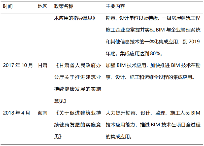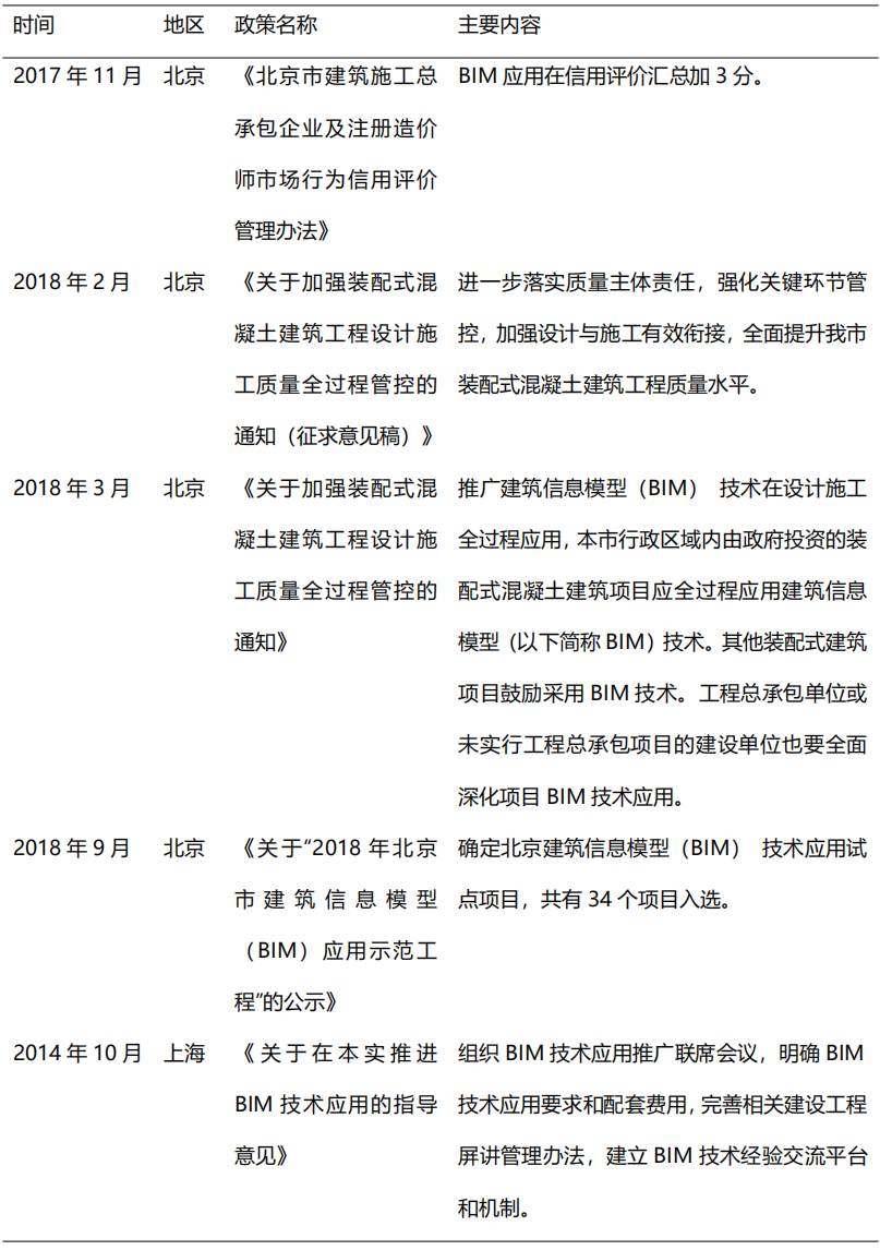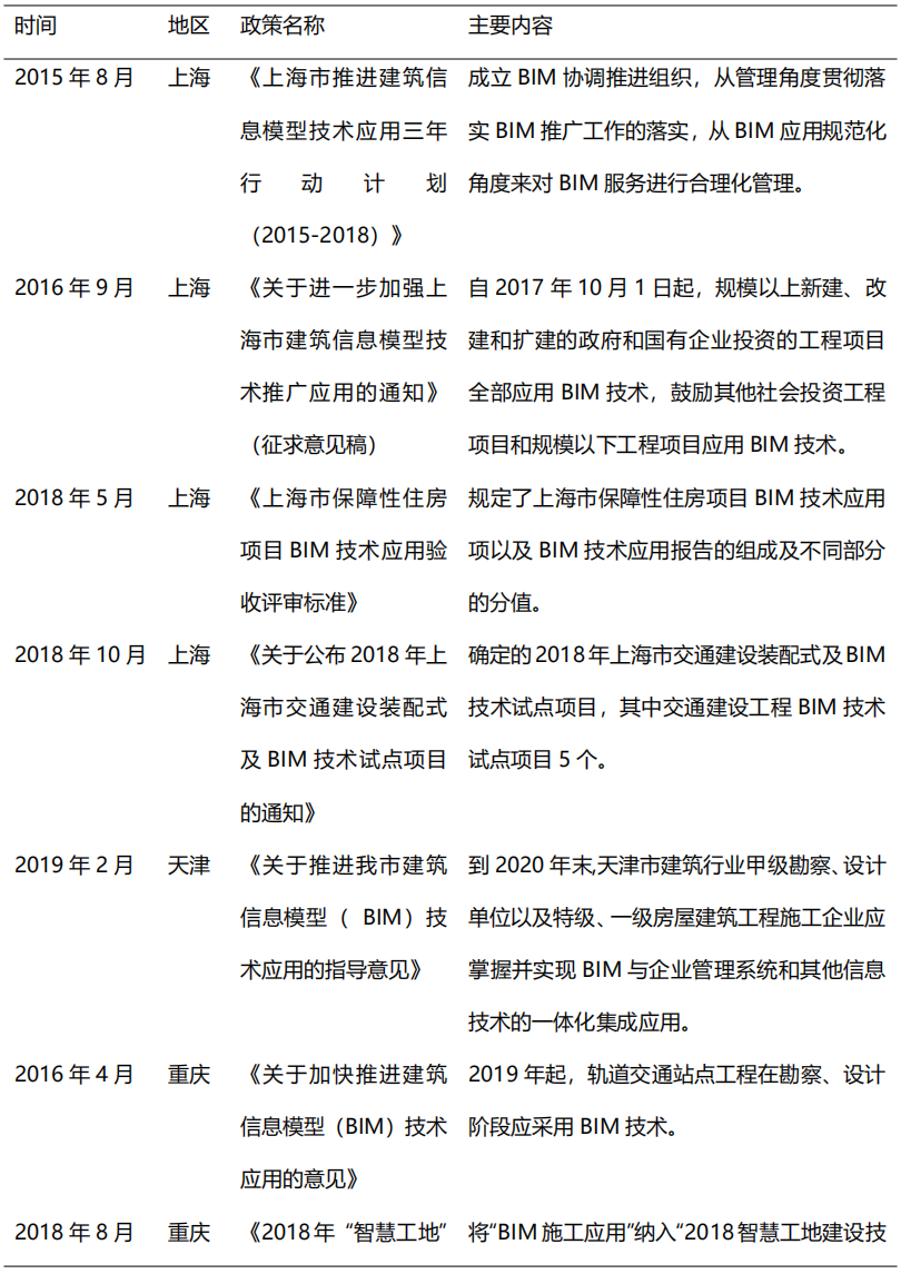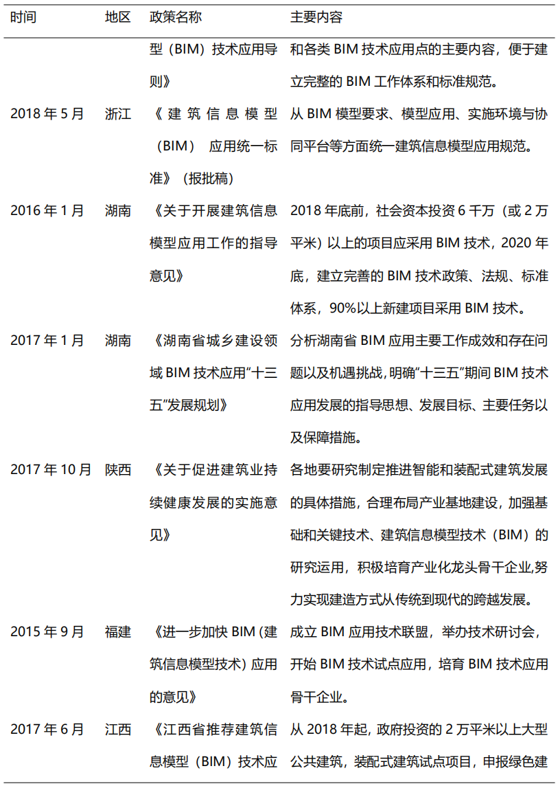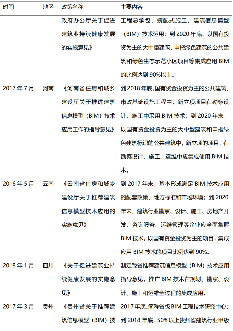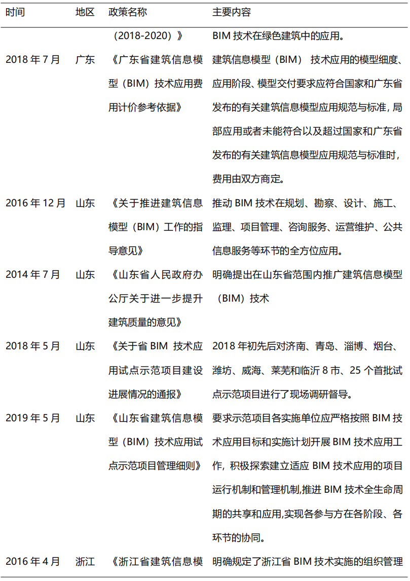 从2014年开始,在住建部的大力推动下,各省市政策相继出台BIM推广应用文件,到目前我国已初步形成BIM技术应用标准和政策体系,为BIM的快速发展奠定了坚实的基础。2017年,贵州、江西、河南等省市正式出台BIM推广意见,明确提出在省级范围内提出推广BIM技术应用。2018-2019年,各地政府对于BIM技术的重视程度不减,重庆、北京、吉林、深圳等多地政策出台指导意见,旨在推动BIM技术进一步应用普及。随着我国出台BIM推广意见的省市数量逐渐增多,全国BIM技术应用推广的范围更加广泛。表2列举了部分重要地方鼓励政策。