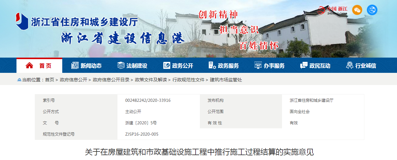 2020年5月20日,浙江省住建厅发布《关于在房屋建筑和市政基础设施工程中推行施工过程结算的实施意见》:自6月20日起,在全省房建和市政项目中全面推行施工过程结算。