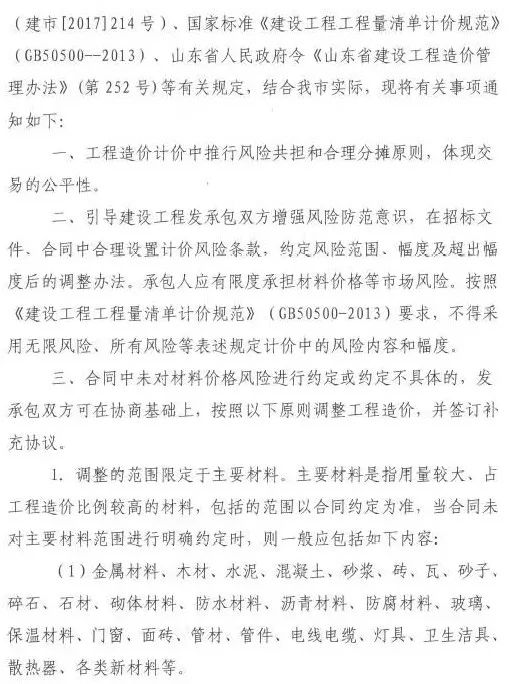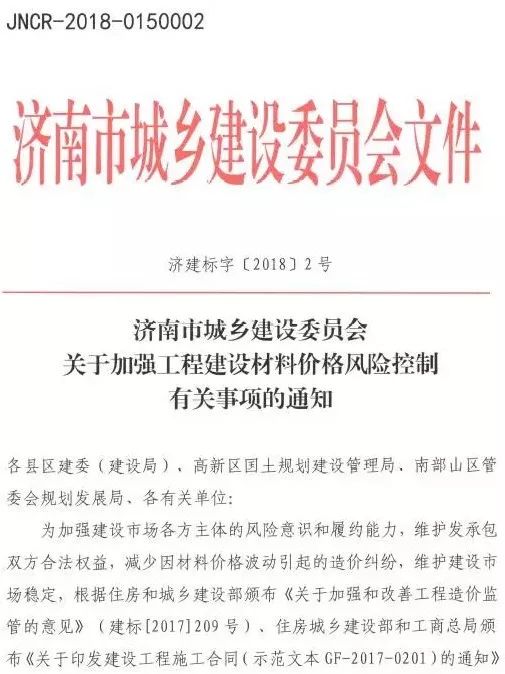 2018年1月30日,济南市住建委印发《关于加强工程建设材料价格风险控制有关事项的通知》(济建标字〔2018〕2号),明确工程计价中应推行风险共担和合理分摊原则,承包人应有限度承担材料价格等市场风险。