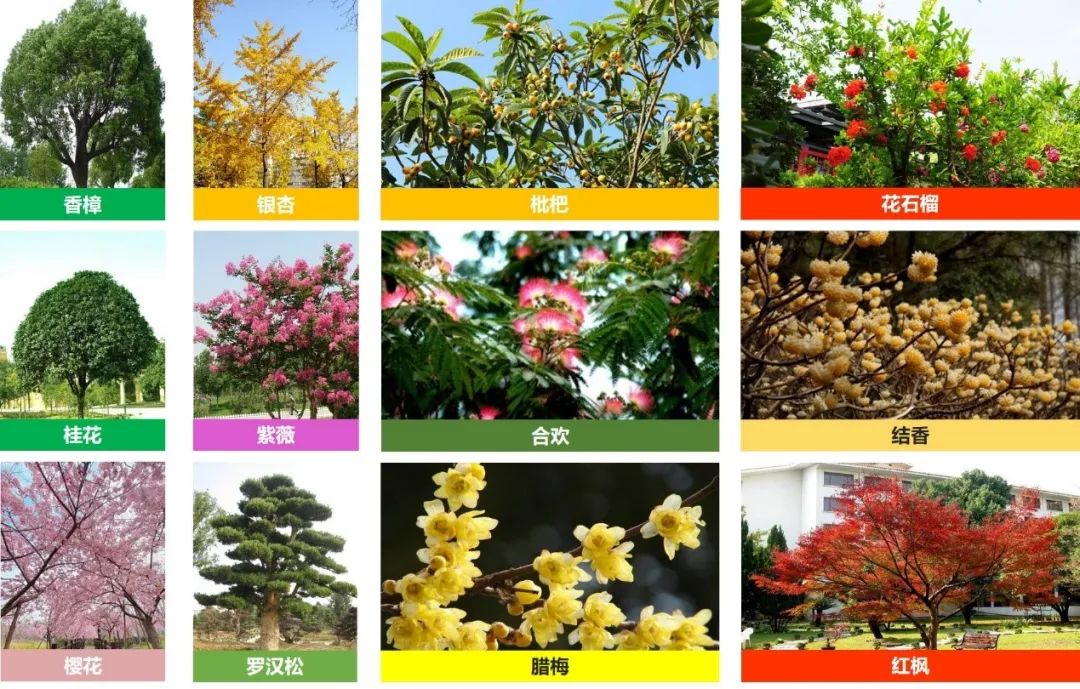 (3)选择树形美观,花色艳丽、景观效果较好的树种为开花小乔木及花灌木,如:樱花、紫薇、花石榴、腊梅等。