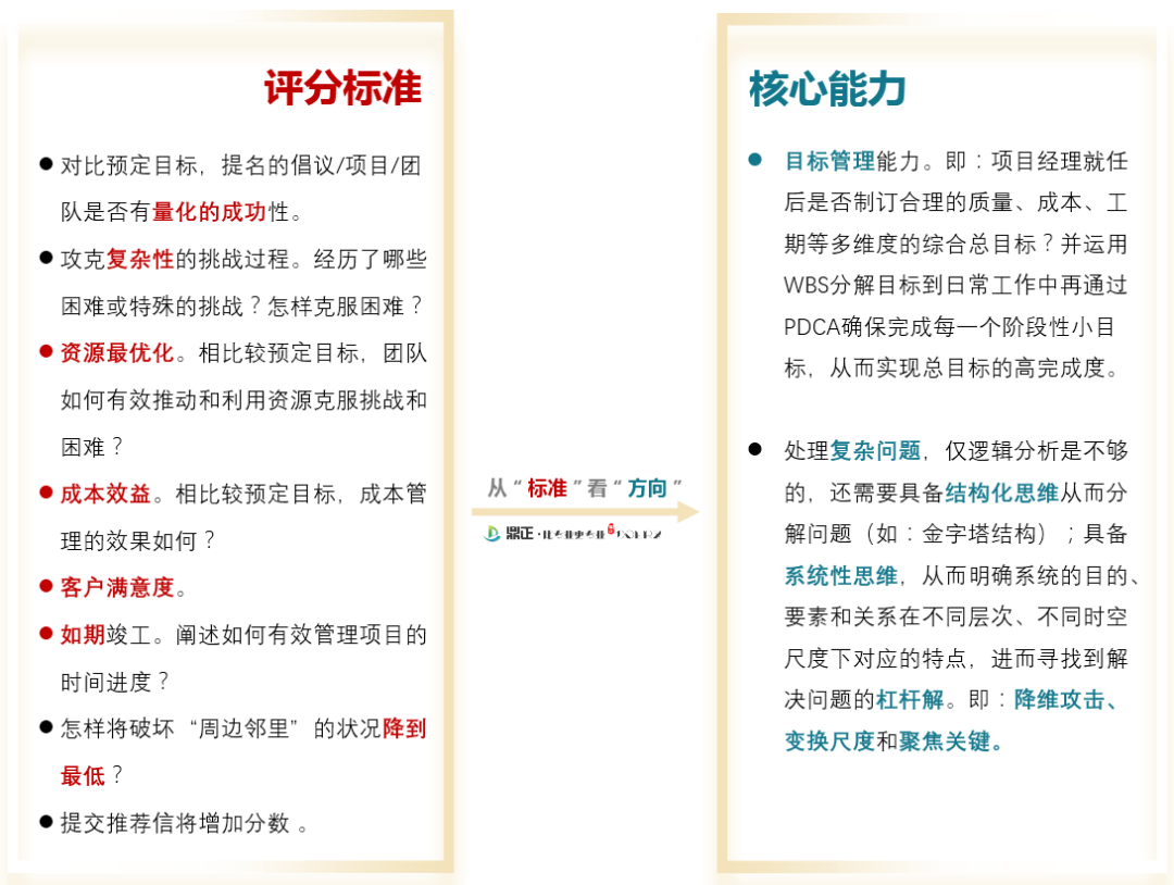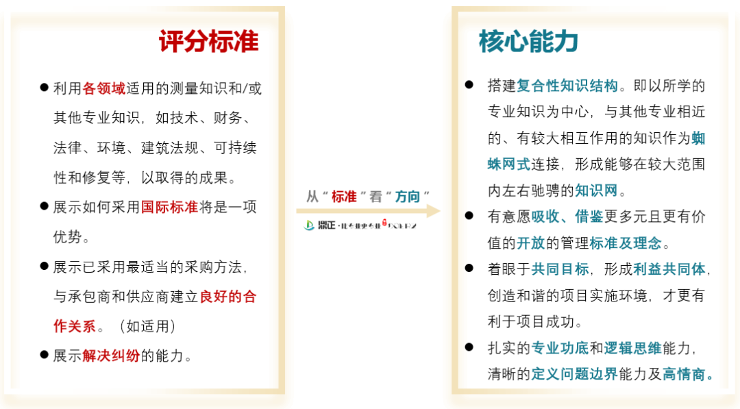 通过此次评奖申报过程中的思考与体会,我们想从RICS中国奖评分标准谈谈项目经理的努力方向。无论是投资决策咨询、规划设计,还是政府采购与招标代理、工程造价咨询、工程监理及项目管理咨询的项目经理,都需要明确优秀的项目管理是什么样的?要实现这些成果需要培养并精进哪些核心能力?