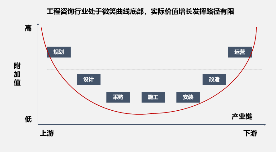 传统工程咨询处于微笑曲线底部,要实现价值增长需要咨询业务“向前推进”、“向后延伸”。如传统的全过程投控顾问服务,已经无法满足客户的需求,客户迫切需要解决的是如何降低工程建设投资,如何做好概算控制,如何使项目增值等问题。