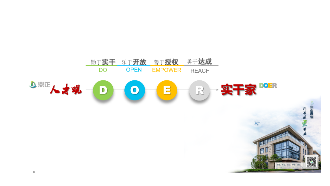 鼎正“DOER实干家”人才观,是我们对人才认知的基本价值观,亦是人才发展成长的路径,它能具体化指导同事们在工作中“对于自己、对于他人、对于团队、对于上级”分别能做些什么、该如何去做,从而调动和培养同事们发展的内驱力和工作的协同性。