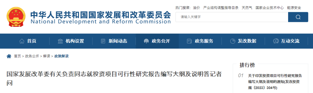 近日,国家发展改革委印发《投资项目可行性研究报告编写大纲及说明》(发改投资规〔2023〕304号,以下简称“可研大纲”),自5月1日起施行,具体包括《政府投资项目可行性研究报告编写通用大纲(2023年版)》《企业投资项目可行性研究报告编写参考大纲(2023年版)》和《关于投资项目可行性研究报告编写大纲的说明(2023年版)》(以下分别简称《通用大纲》《参考大纲》和《编写说明》)。国家发展改革委有关负责同志就此接受采访,回答记者提问。