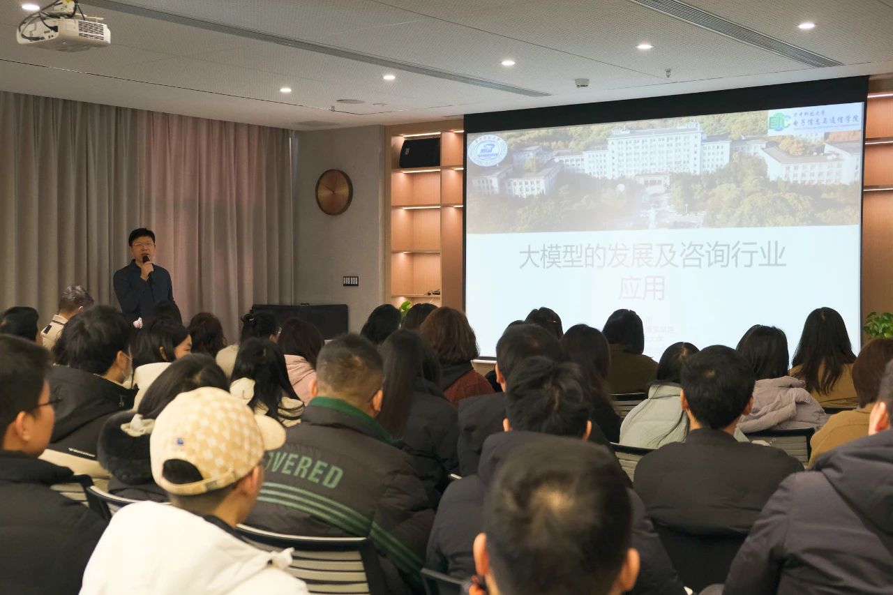 本次培训有幸邀请到华中科技大学电子信息与通信学院张小刚老师授课。张老师从大模型发展现状、大模型应用关键技术及大模型在咨询行业咨询应用等方面展开分享,并为大家带来了一场干货满满的培训。
