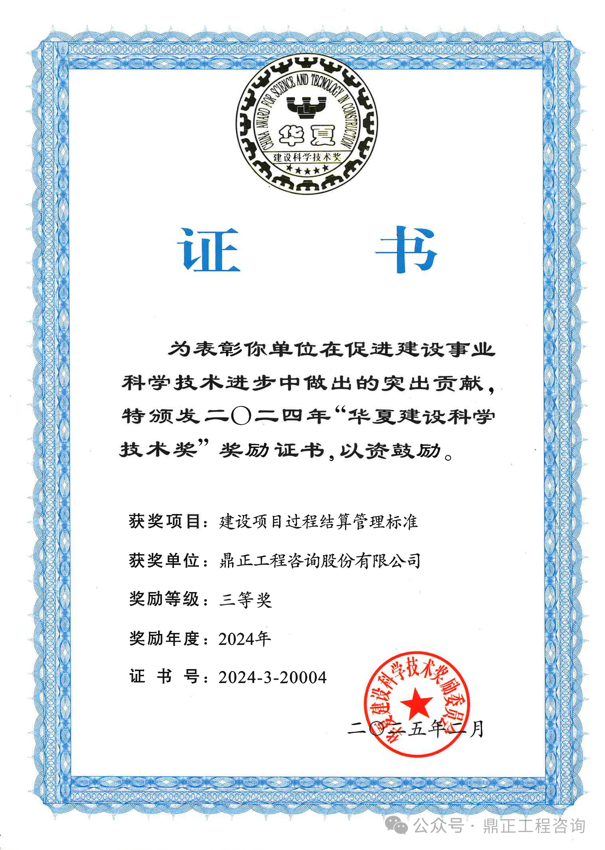 鼎正参与编制的《建设项目过程结算管理标准》(T/CECS 1178-2022)通过专业组和评审委员会的两级评审,从700余个报送项目中脱颖而出,荣获2024年度华夏建设科学技术奖三等奖。