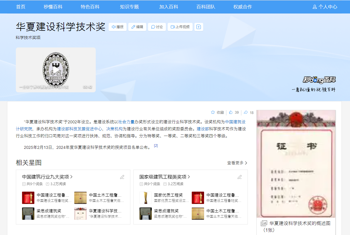 “华夏建设科学技术奖”于2002年设立,是中国建筑行业九大核心奖项之一,与鲁班奖、詹天佑奖等齐名。该奖项经国家科技部批准设立,是建设系统以社会力量办奖形式设立的全国建设行业最高科学技术奖项。其旨在奖励在建设行业工作中有重要贡献的组织和公民,贯彻科教兴国战略,促进科技成果向生产力转化,推动科技进步、提升技术水平、培养科技人才,全面提升我国建设行业综合科技创新水平。
