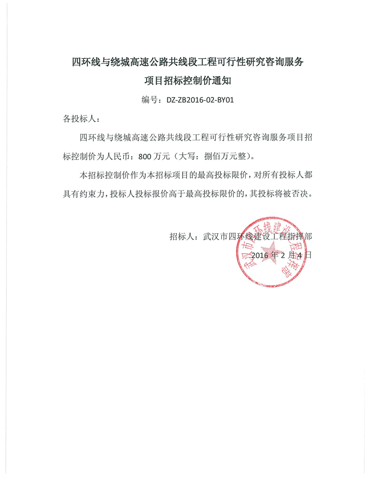 四环线与绕城高速公路共线段工程可行性研究咨询服务项目招标控制价通知