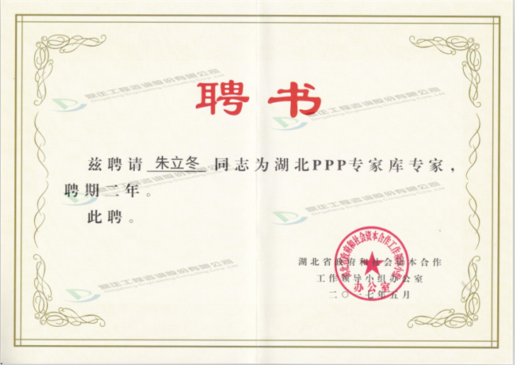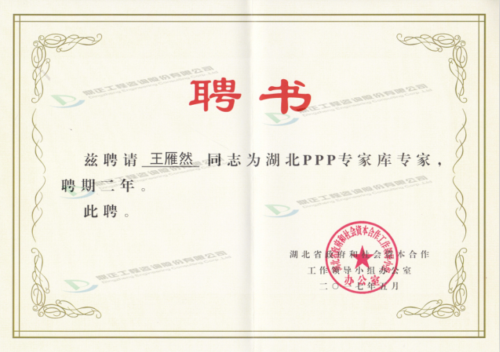 近日,湖北省政府和社会资本合作工作领导小组办公室授予鼎正公司董事长王雁然先生、副总经理兼技术总监朱立冬教授为湖北省PPP专家库专家。此前