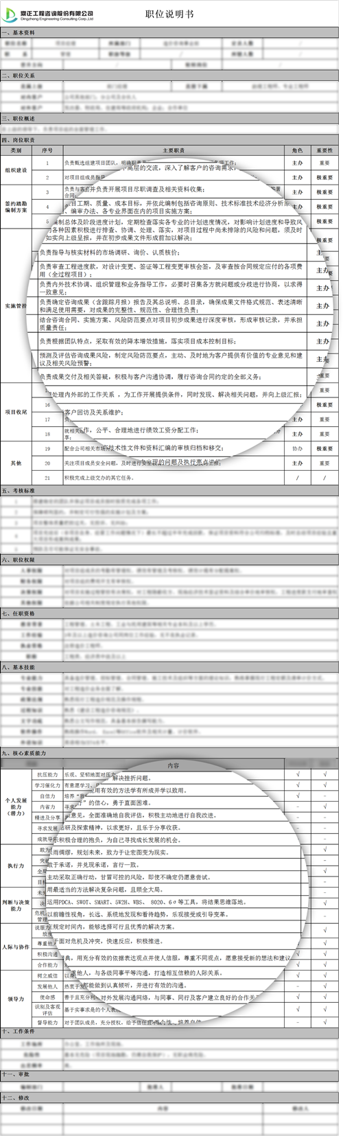 为优化人才队伍结构及提高能力素质,鼎正人资部与造价咨询事业部通过对项目经理岗位职责进行列举和归类,对工作流程、部门内各职位间的职责分配进行分析和规划,共同编写了造价咨询事业部项目经理岗位说明书,以便项目经理和准项目经理们全方位了解工作目标以及在个人能力素质方面的差距,从而制定合理的学习计划。