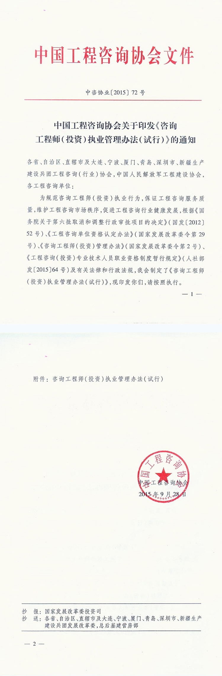 第四条  中国工程咨询协会(以下简称“中咨协会”)是全国工程咨询行业的自律组织,负责管理咨询工程师(投资)及工程咨询单位与咨询工程师(投资)相关事项的执业行为。