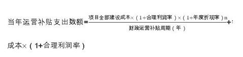 对可行性缺口补助模式的项目,在项目运营补贴期间,政府承担部分直接付费责任。政府每年直接付费数额包括:社会资本方承担的年均建设成本(折算成各年度现值)、年度运营成本和合理利润,再减去每年使用者付费的数额。计算公式为: